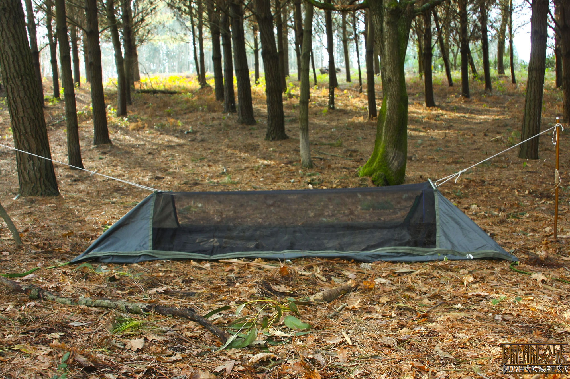 Aquí podemos ver en su parte mas distante, la funda recogida que usaremos para alejar la lluvia del dia de nuestra cama colgante.